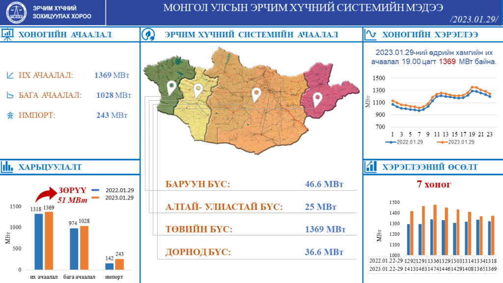 Эрчим хүчний системийн 2023.01.29-ны өдрийн оргил ачаалал 19.00 цагт 1369 МВт хүрч өнгөрсөн оны мөн үеэс 51 МВт-аар, импорт 101 МВт-аар тус тус өссөн байна.