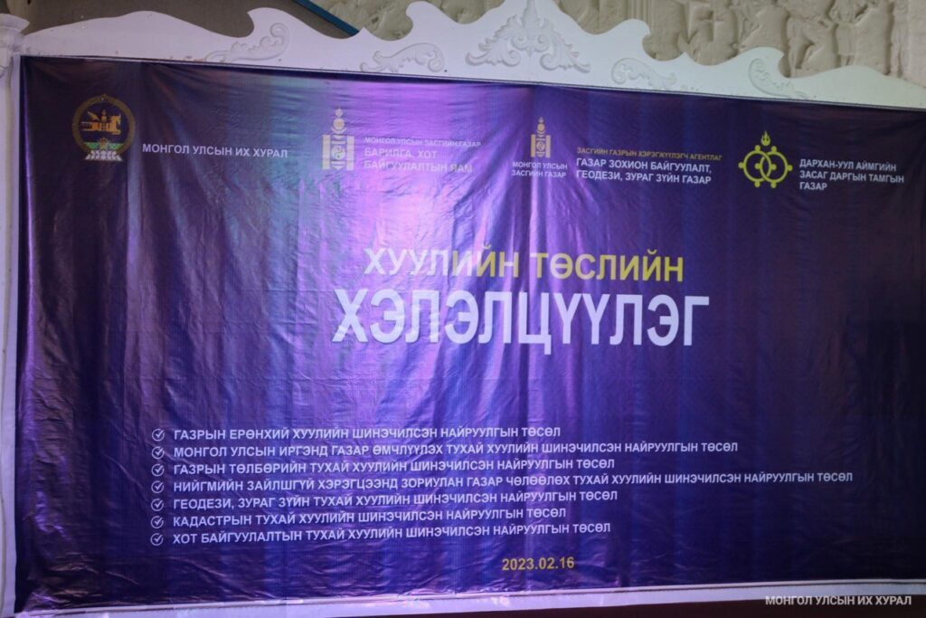 Монгол Улсын Засгийн газраас 2022 оны зургаадугаар сарын 17-ны өдөр Улсын Их Хуралд өргөн мэдүүлсэн Газрын багцхуулийн төсөл болон хамт өргөн мэдүүлсэн хуулийн төслүүд, 2022 оны 10 дугаарсарын 12-ны өдөр Улсын Их Хуралд өргөн мэдүүлсэн Геодези, зураг зүйн тухай хуулийн шинэчилсэн найруулгын төсөл болон хамт өргөн мэдүүлсэн төслүүд, 2022оны 01 дүгээр сарын 22-ны өдөр Улсын Их Хуралд өргөн мэдүүлсэн Хот байгуулалтын тухай хуулийн шинэчилсэн найруулгын төсөл болон хамт өргөн мэдүүлсэн хуулийнтөслүүдийг нээлттэй хэлэлцүүллээ.