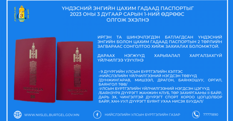 “Өнөөдрөөс эхлэн шинэчлэгдэн батлагдсан үндэсний энгийн цахим гадаад паспортыг захиалах боломжтой” гээд төлбөрийн мэдээллийг УБЕГ-аас танилцууллаа.