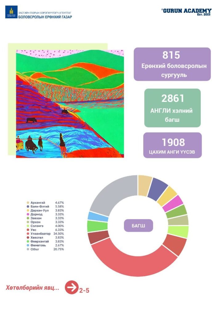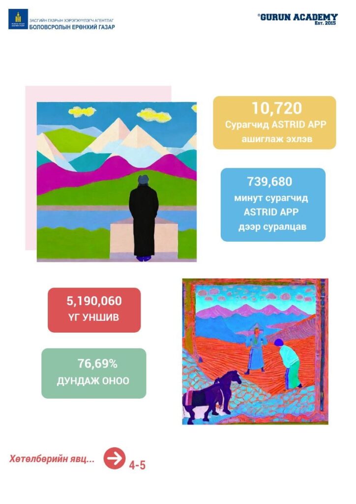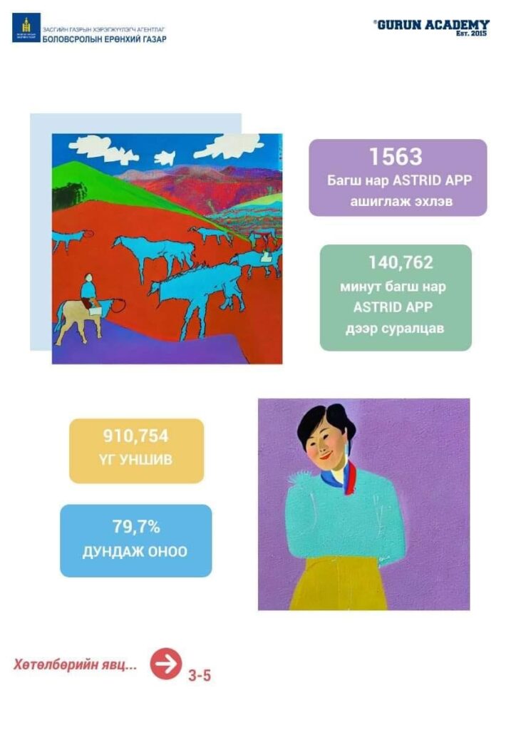 Орон даяар ерөнхий боловсролын сургуулийн VI-XII ангийн сурагчдын англи хэлний ярианы чадварыг хиймэл оюунд суурилсан технологийн тусламжтай ахиулах GLOBAL NOMAD төслийн хүрээнд нийт 2861 Англи хэлний багшийг бүртгэн, сургалаа.
