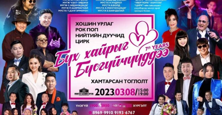 Бидний нэрлэж заншсанаар Март 8 буюу олон улсын эмэгтэйчүүдийн эрхийг хамгаалах өдөр болоход хэдхэн хоног үлдсэн байна. Хайртай хань, халамжит ээж, охид бүсгүйчүүдээ баярлуулахыг хүссэн хэн бүхэнд зориулан “Бүх хайрыг бүсгүйчүүддээ” тоглолт Монгол Бөхийн өргөөнд гуравдугаар сарын 8-ны 15:00, 19:00 цагуудаас тус тус болохоор болжээ.
