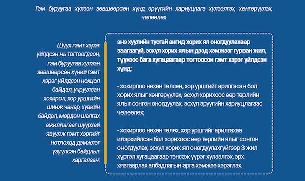 Улсын Их Хурлын 2022 оны намрын ээлжит чуулганаар хэлэлцэж баталсан хууль тогтоомжийн талаарх танилцуулга, инфографикийг уншигч Та бүхэнд цувралаар хүргэж байна. Энэ удаа Эрүүгийн хуульд нэмэлт, өөрчлөлт оруулах тухай хуулийн танилцуулга, инфографикийн хамт хүргэж байна.