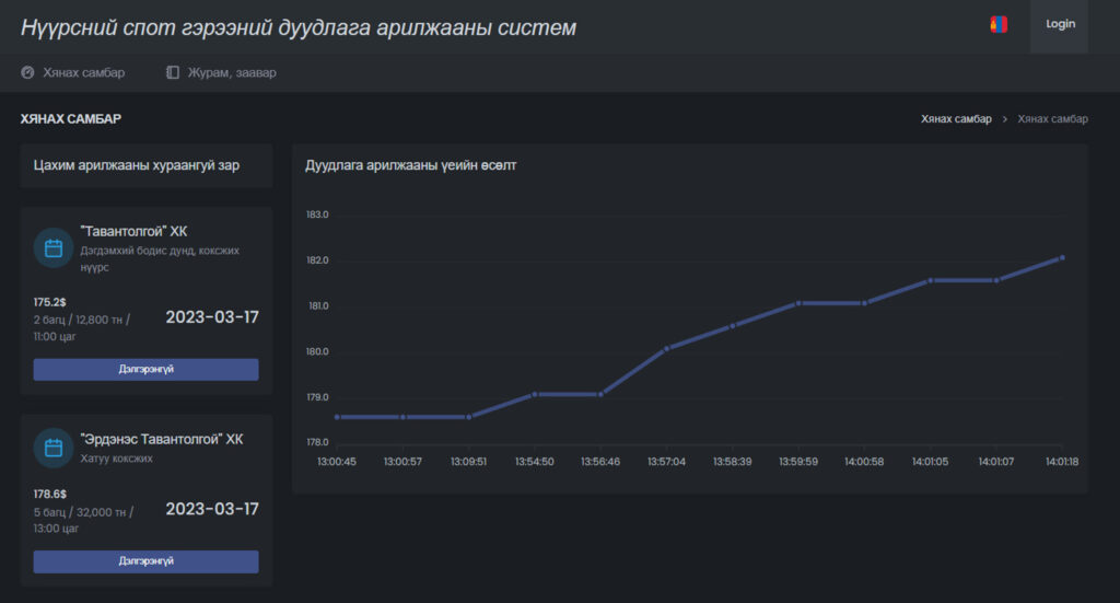 Энэ удаагийн цахим арилжаанд БНХАУ-ын Xianjiade Energy resources International, “Shuangquan Energy, Wangjin Energy зэрэг гурван компани оролцож нэг тонн нүүрсийг 178,6 ам.доллароос дуудаж 182,1 ам.доллароор арилжлаа.
