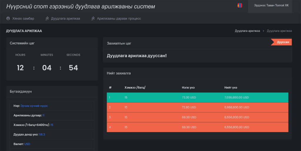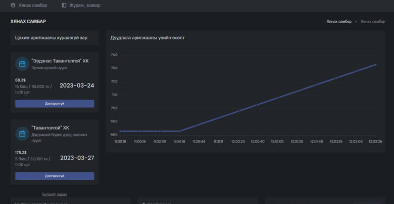 Цахим арилжаанд нийт 4 аж ахуйн нэгж оролцож нэг тонн эрчим хүчний нүүрсийг 68.30 ам.доллароос дуудаж 73.30 ам.доллароор арилжлаа. Өмнө нь түүхий коксжих нүүрсийг биржээр арилжаалж байсан бол энэ удаад эрчим хүчний нүүрсийг биржээр амжилттай борлууллаа. “Эрдэнэс Тавантолгой” ХК 2020 онд эрчим хүчний нүүрсийг уурхайн ам нөхцөлөөр тонн тутмыг 9.5 ам.доллароор борлуулж байсан бол өнөөдөр хил нөхцөлөөр 73.30 ам.доллароор амжилттай борлууллаа.