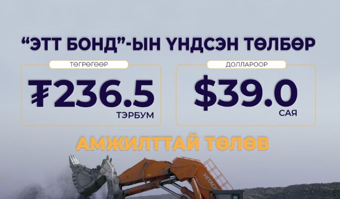 "Эрдэнэс Тавантолгой" ХК нь 2021 онд дотоодын зах зээлээс босгосон “ЭТТ БОНД”-ын 236.5 тэрбум төгрөг, 39 сая ам.долларын үндсэн төлбөрийг өнөөдөр /2023.04.07/ амжилттай төллөө.