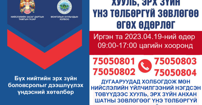 Энэ удаагийн өдөрлөгийг өнөөдөр буюу дөрөвдүгээр сарын 19-ний 09:00-17:00 цагийн хооронд зохион байгуулна. Иргэн та 75050801, 75050802, 75050803, 75050804 дугаарын утсаар холбогдож, мөн Нийслэлийн Үйлчилгээний нэгдэн төвүүдээсиргэний эрх зүй, захиргааны эрх зүй, эрүүгийн эрх зүй болон гэр бүл, гэрээний эрх зүй зэрэг сэдвээр хууль, эрх зүйн үнэ төлбөргүй зөвлөгөө, мэдээлэл авах боломжтой.