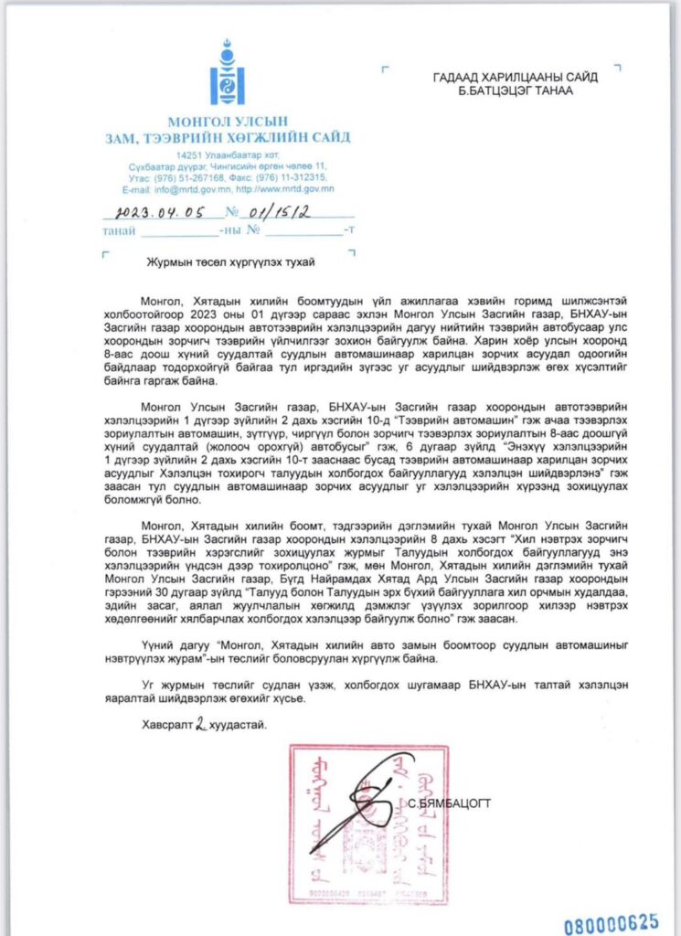 Энэ хүрээнд хоёр талын холбогдох байгууллагуудын төлөөллийг оролцуулсан уулзалт зохион байгуулж, “Монгол, Хятадын хилийн авто замын боомтоор суудлын автомашиныг нэвтрүүлэх журам”-ын төслийг танилцуулсан. Энэхүү журмын төслийг Гадаад харилцааны яамаар дамжуулан Хятадын талтай тохирохоор ажиллаж байна.