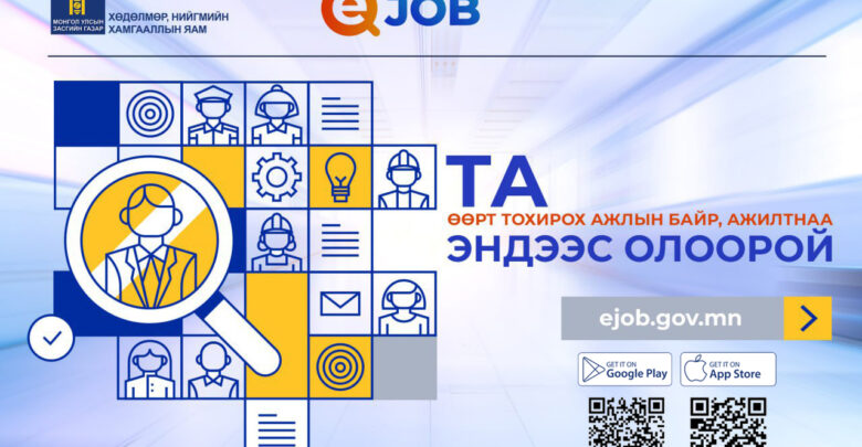 Хөдөлмөр, нийгмийн хамгааллын сайдын тушаалаар батлагдсан “Хөдөлмөр эрхлэлтийн цахим систем “Ejob” платформыг хэрэглээнд нэвтрүүлэх, ашиглалтыг сайжруулах ажлын төлөвлөгөө”-ний дагуу ажил хайгч иргэн, бүртгэлтэй ажилгүй иргэн, ажил олгогч аж ахуйн нэгж, байгууллага, ажлын байрны захиалга, ажилд зуучлал, шинэ ажлын байрны мэдээллийг Хөдөлмөр эрхлэлтийн цахим систем “Еjob”-д бүртгэх, системийн баазыг бүрдүүлэх, бүртгэлийг эрчимжүүлэх, сурталчлах арга хэмжээг үе шаттай зохион байгуулж байна.