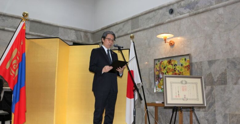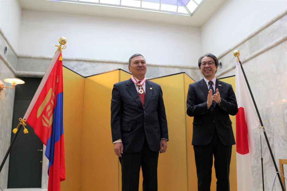 Элчин сайд Х.Кобаяши “Япон, Монголын харилцааг хөгжүүлэхэд томоохон хувь нэмрээ оруулсан Монгол дахь Япон судлалын нийгэмлэгийн тэргүүн Ц. Батбаяр Танд “Мандах нар” одонгийн “Хүзүүний тууз бүхий Алтан туяа” зэрэглэлийн одонгоор шагнуулж байгаад чин сэтгэлээсээ баяр хүргэе.