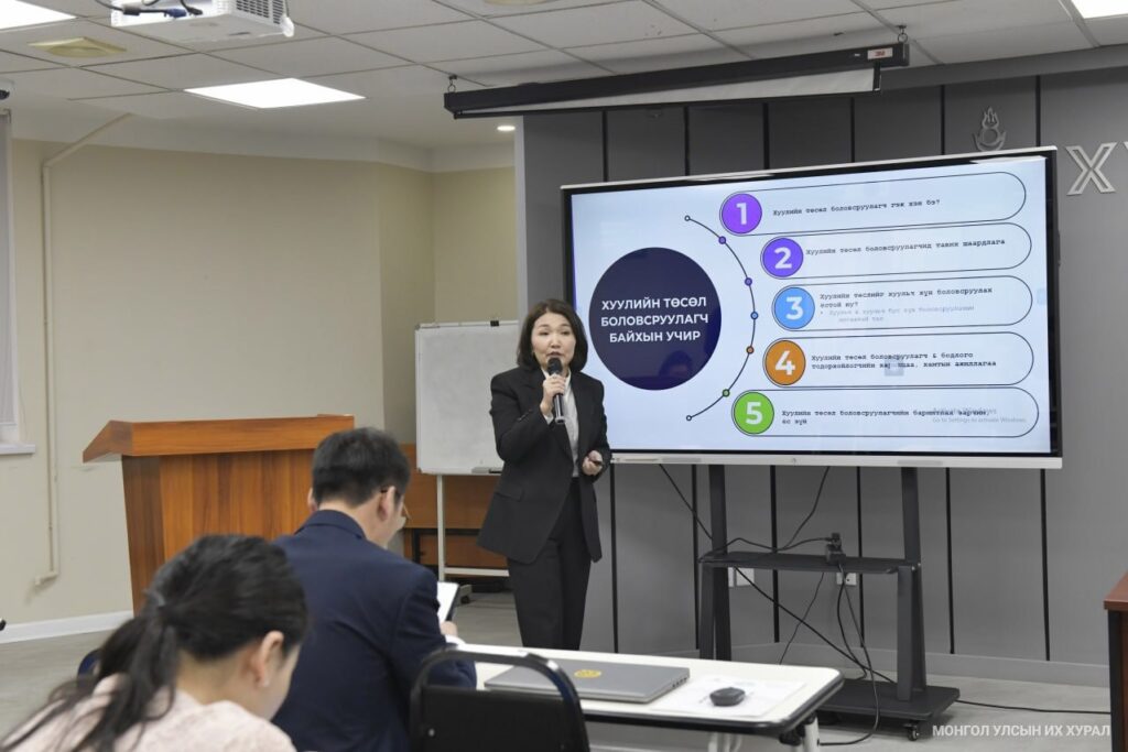 Улсын Их Хурлын Тамгын газраас Монголын Хуульчдын холбоо, Швейцарын хөгжлийн агентлагтай хамтран зохион байгуулж буй Хуулийн төсөл боловсруулагчдын сургалт (2023.05.24) эхэллээ. Парламентат ёс өндөр түвшинд төлөвшсөн улс орнуудын нийтлэг жишгийн дагуу зохион байгуулж буй энэхүү сургалтын бэлтгэл хангах ажлыг 2021 оноос эхлүүлсэн бөгөөд оролцогчдод 3.0 кредит олгож, батламж гардуулах юм.