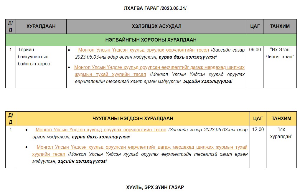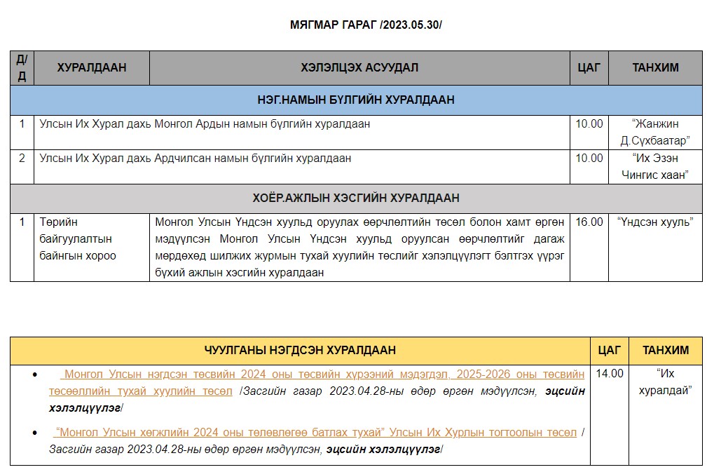 Нүүр /Focus/УИХ-ын Ээлжит чуулган /2023.05.29-06.02/ FocusУИХ УИХ-ын Ээлжит чуулган /2023.05.29-06.02/ Улсын Их Хурлын даргын дэргэдэх Зөвлөлийн 2023.05.19-ний өдрийн хурлаар батлав. ТагУИХ