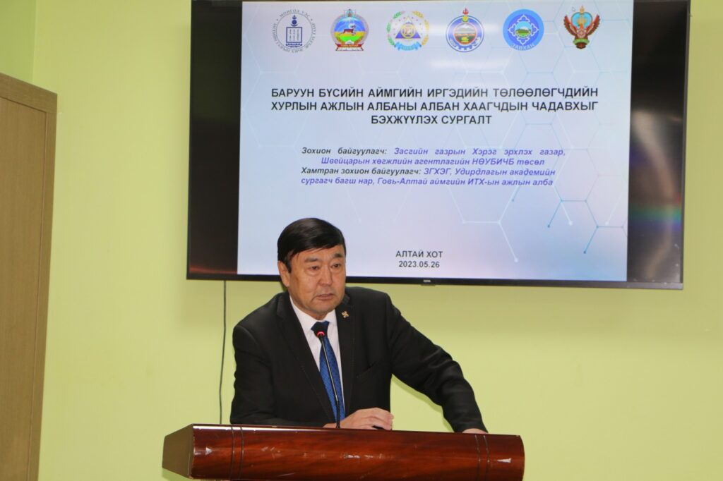 Говь-Алтай аймгийн Нутгийн удирдлагын ордонд болсон /2023.05.26/ тус сургалтыг Засгийн газрын хэрэг эрхлэх газар, Швейцарын хөгжлийн агентлагийн НӨУБИЧБ төслийн баг, Удирдлагын академийн сургагч багш нар хамтран зохион байгуулсан юм. Сургалтад Баян-Өлгий, Завхан, Увс, Ховд, Говь-Алтай аймгийн ИТХ-ын төлөөлөгч, ажлын албаны албан хаагчид бүхий 80 гаруй хүн оролцлоо.