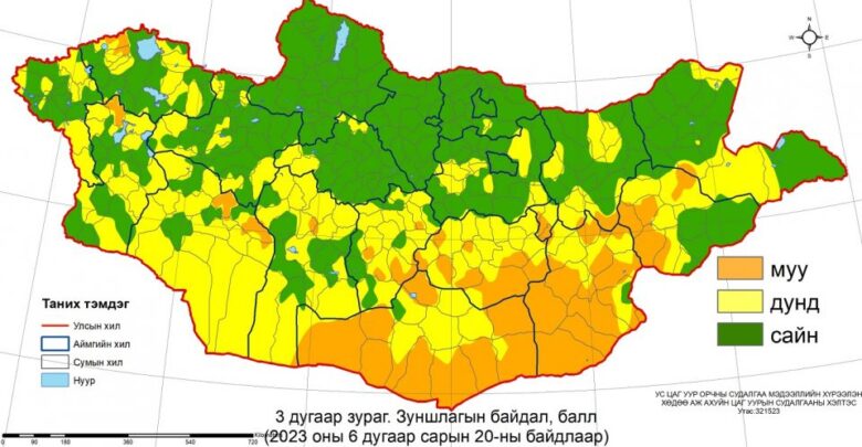Цаг уурын байгууллагын ирүүлсэн мэдээгээр энэ сарын 20-ны байдлаар зуншлага нийт нутгийн 50 орчим хувьд хэвийн, 40 орчим хувьд дунд, 10 орчим хувьд муу үнэлгээ гарчээ.