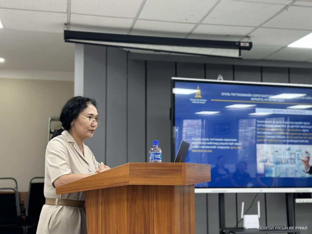 Үргэлжлүүлэн “Хууль тогтоомжийн хэрэгжилтэд хийх үр дагаврын үнэлгээ” сэдвээр Улсын Их Хурлын Тамгын газрын Парламентын номын сангийн дарга С.Янжинхорлоо илтгэл танилцууллаа.