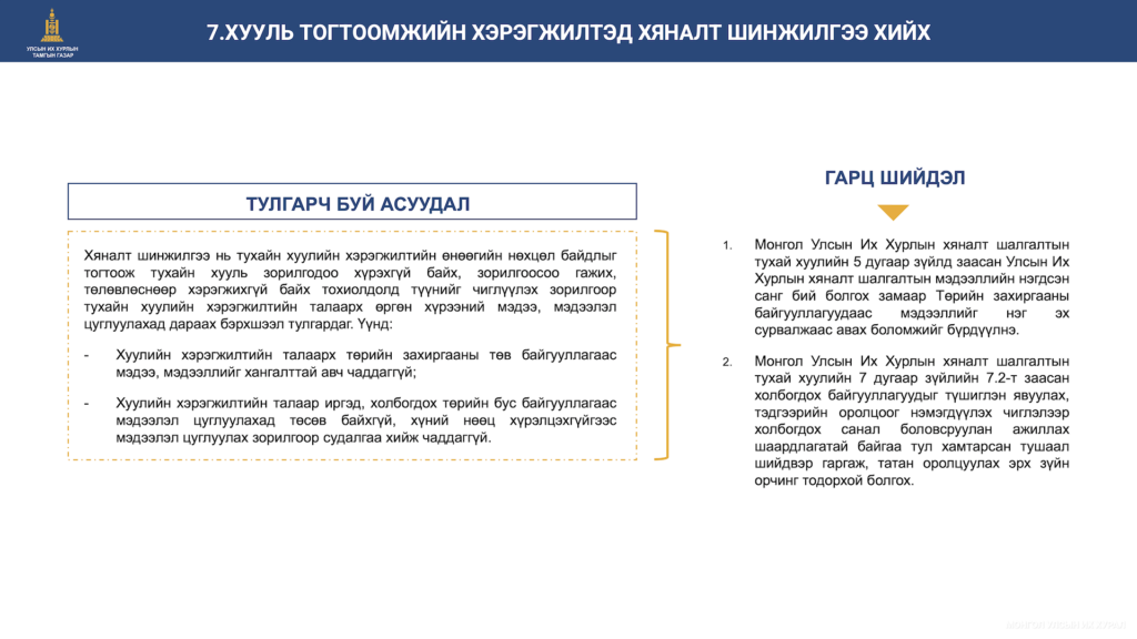 Хяналтын сонсгол зохион байгуулах эрх зүйн зохицуулалт, хяналтын сонсголын төрлүүд болон Улсын Их Хурлаас зохион байгуулсан хяналтын сонсгол, тэдгээрийн үр дүнгийн талаар танилцуулж, илтгэгч тус бүрийн дараа оролцогчид сонирхсон асуултдаа хариулт авлаа.