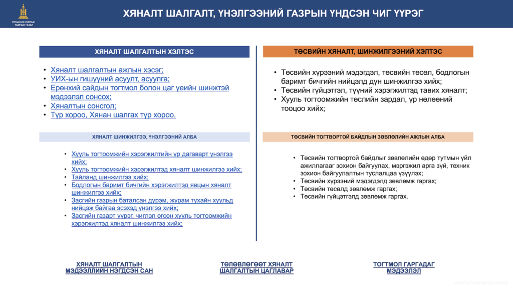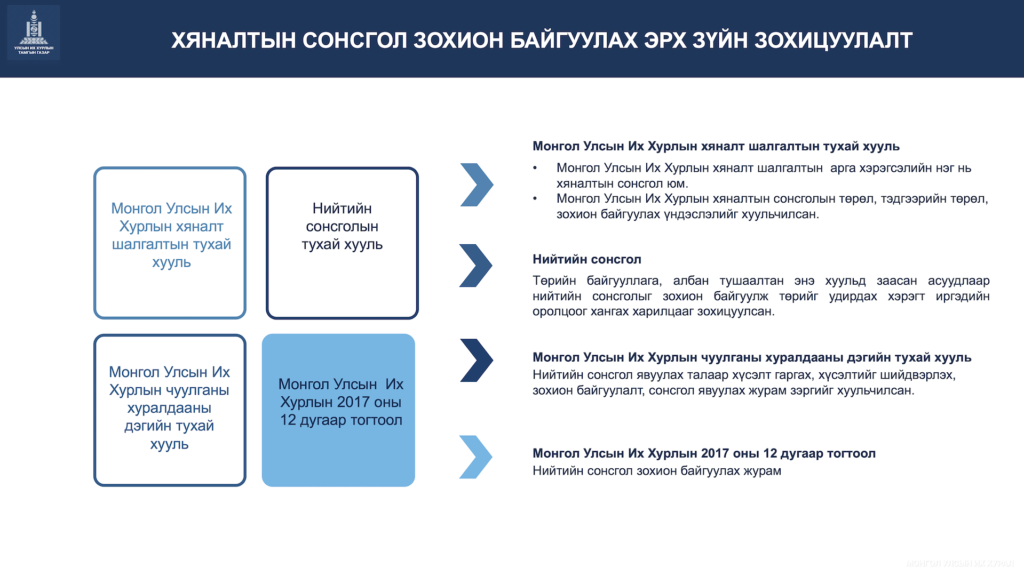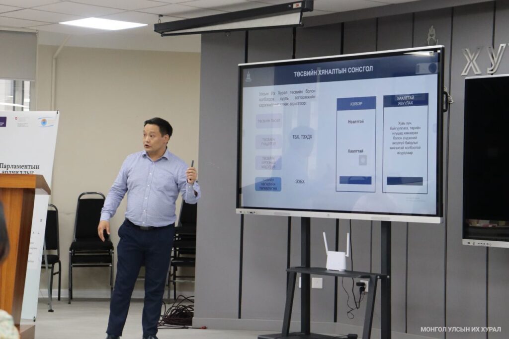 Мөн Улсын Их Хурлын Тамгын газрын Хяналт шалгалт, үнэлгээний газрын Хяналт шалгалтын хэлтсийн дарга Ж.Лхагвасүрэн “Хяналт шалгалтын процесст иргэний нийгэм, сэтгүүлчид оролцох боломж” -ийн талаар, Төсвийн хяналт шинжилгээний хэлтсийн дарга Д.Эрдэнэсамбуу “Хяналтын сонсгол”-ын талаар танилцуулав.