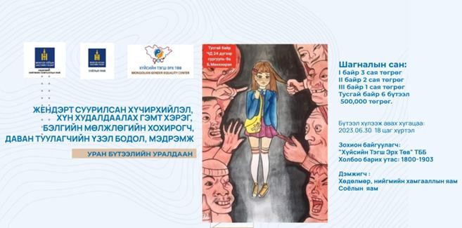 Шалгаруулалт: Уралдаанд оролцох бүтээлүүдийг 2023 оны 07 сарын 30-ны өдрийн 18.00 цаг хүртэл Хүйсийн тэгш эрх төв ТББ хүлээн авна. Хаяг: Урт цагааны урд, Pearl tower, Б корпус, 701 тоот .