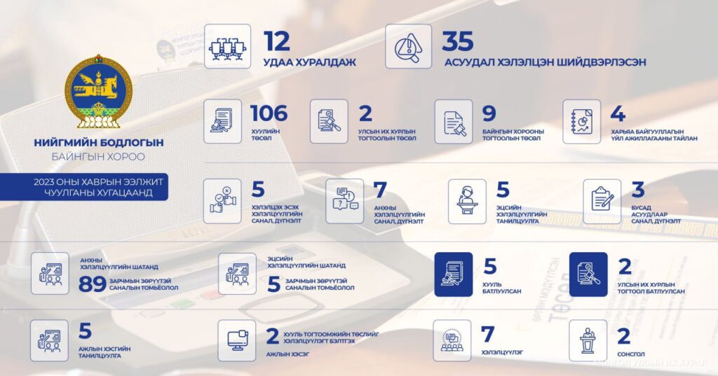 Улсын Их Хурлын 2023 оны хаврын ээлжит чуулганы хугацаанд Нийгмийн бодлогын байнгын хороо 12 удаа хуралдаж, 35 асуудлаар нийт 106 хуулийн төсөл, Улсын Их Хурлын тогтоолын хоёр, Байнгын хорооны есөн тогтоолын төсөл хэлэлцэн шийдвэрлэжээ. Мөн яам, агентлаг, харьяа байгууллагын тайлан, илтгэл, мэдээллийг дөрвөн удаа сонсож хэлэлцэн, албан тушаалтныг томилох, чөлөөлөх асуудлыг нэг удаа хэлэлцэн шийдвэрлүүлсэн байна. Эдгээрийн хүрээнд Улсын Их Хуралд өргөн мэдүүлсэн хууль тогтоомжийн төслийг хэлэлцэх, эсэх асуудлаар тав, анхны хэлэлцүүлгийн долоон санал дүгнэлт, эцсийн хэлэлцүүлгийн таван танилцуулга, бусад асуудлаар гурван санал, дүгнэлт бэлтгэж холбогдох Байнгын болон дэд хороонд хүргүүлжээ. Ажлын хэсгийн таван танилцуулга, Байнгын хорооны болон нэгдсэн хуралдааны анхны хэлэлцүүлгийн шатанд зарчмын зөрүүтэй 89 саналын томьёолол, эцсийн хэлэлцүүлгийн шатанд зарчмын зөрүүтэй таван саналын томьёолол тус тус бэлтгэсэн байна.