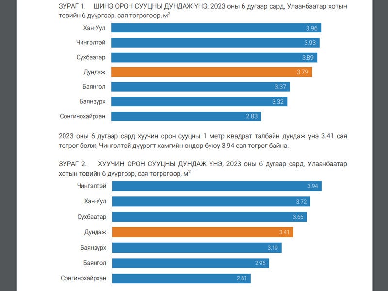 2023 оны зургаадугаар сард шинэ орон сууцны нэг метр квадрат талбайн дундаж үнэ 3.79 сая төгрөг болж, Хан-Уул дүүрэгт хамгийн өндөр буюу 3.96 сая төгрөг, Сонгинохайрхан дүүрэгт хамгийн бага буюу 2.83 сая төгрөг байна.