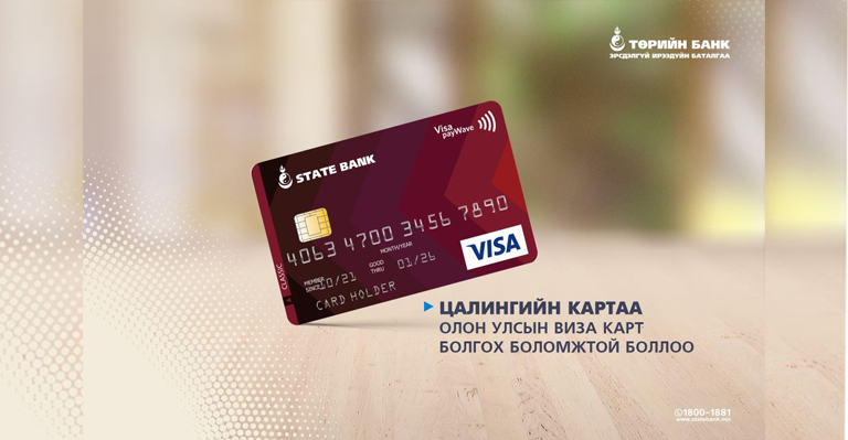 Дотоодын төдийгүй Олон Улсын төлбөр тооцоонд ашиглагдах, EMV чиптэй, PayWave зайнаас унших технологи бүхий Виза картыг Төрийн банкаар цалингаа авдаг харилцагч бүр цалингийн харилцах дансандаа захиалах боломжтой.