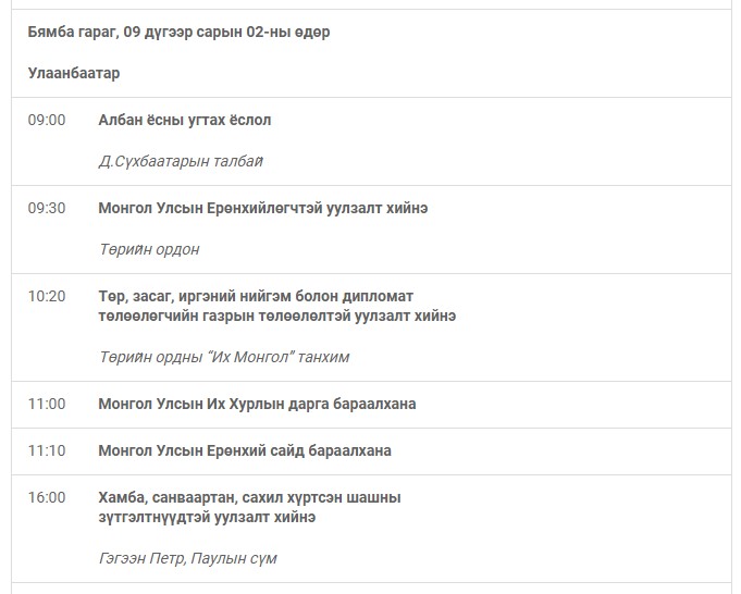 Гэгээн Ширээт Улсын Төрийн тэргүүн Пап Францисын Монгол Улсад хийх төрийн айлчлалын хөтөлбөр