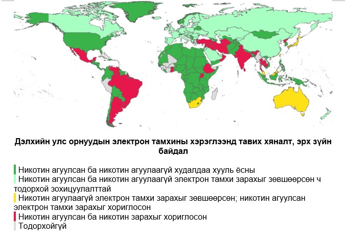 Дэлхий дээрх никотин агуулсан эсвэл никотингүй электрон тамхины эрх зүйн байдлыг дээрх газрын зургаас харж болно. Дэлхий нийтээр Covid-ийн идэвхтэй үе намжсаны дараа электрон тамхины асуудал анхаарал татаж байна.