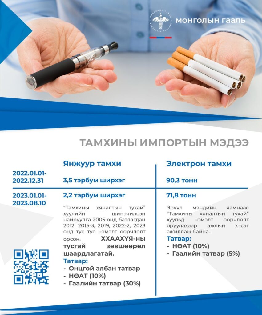 Харин 2022 онд 90.3 тонн, 2023 оны 8-р сарын 10-ны байдлаар 71.8 тонн электрон тамхи импортолжээ.