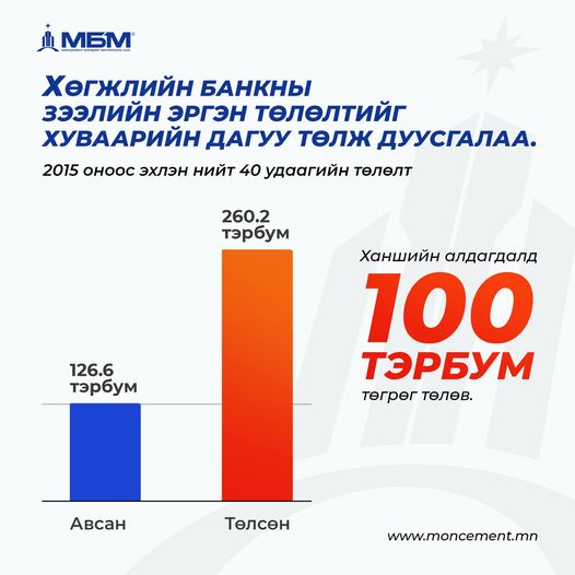 Монполимет Групп нь Монцемент цогц үйлдвэрийн төслийн хүрээнд Хөгжлийн банкнаас нийт төслийн хөрөнгө оруулалтын 20%-д буюу зээл олгосон үеүдийн дундаж ханшаар 126.6 тэрбум төгрөг авснаас нийт 260.2 тэрбум төгрөгийн эргэн төлөлтийг 100 гаруй тэрбум төгрөгийн ханшийн алдагдлын хамт хуваарийн дагуу төлж дууслаа.