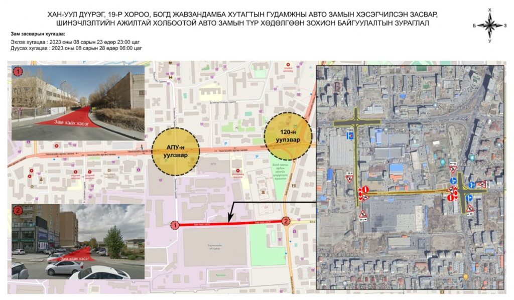 Хан-Уул дүүрэг 19-р хороо Богд Жавзандамба хутагтын гудамжны авто замыг 2023 оны 08 дугаар сарын 23-ний өдрийн 23:00 цагаас 2023 оны 08 дугаар сарын 28-ний өдрийн 06:00 цагийн хооронд хааж засвар, шинэчлэлтийн ажлыг хийж гүйцэтгэнэ.