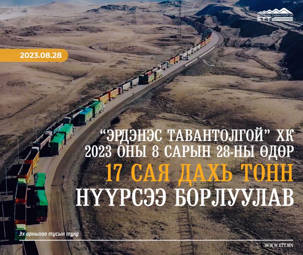“Эрдэнэс Тавантолгой” ХК 2023 оны 08 дугаар сарын 28-ны өдөр 17 сая дахь тонн нүүрс борлуулж, компанийн борлуулалтын түүхийг шинэчлэн тогтоолоо.