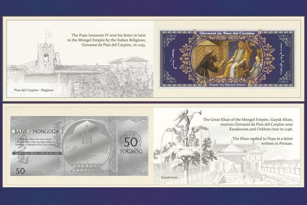 Гэгээн Ширээт Улсын төрийн тэргүүн Пап Францис болон их лам нар болох Жиоржио Маренго болон Луис Антонио Тагле нарын Монгол Улсад хийж буй түүхэн айлчлалыг угтан Монголбанк Монгол Улс дахь Бүгд Найрамдах Итали Улсын Элчин сайдын яамтай хамтран “Монгол-Итали” дурсгалын ялтсан зоосыг гаргалаа.