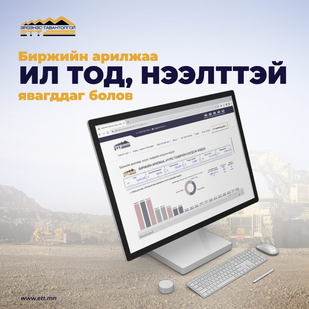 Уул уурхайн бүтээгдэхүүний биржийн тухай хууль хэрэгжиж эхэлснээр “Эрдэнэс Тавантолгой” ХК, Монголын хөрөнгийн биржээр 3.5 сая тонн нүүрсийг 43 удаагийн арилжаагаар, хил нөхцөлөөр борлуулж, 121.7 сая ам.доллар буюу 420.0 тэрбум төгрөгийн нэмэлт орлого оллоо. Биржийн арилжааны мэдээллийг цахим хуудсанд https://ett.mn/mn/news/single/5411?full-screen=true нээлттэй байршуулав.