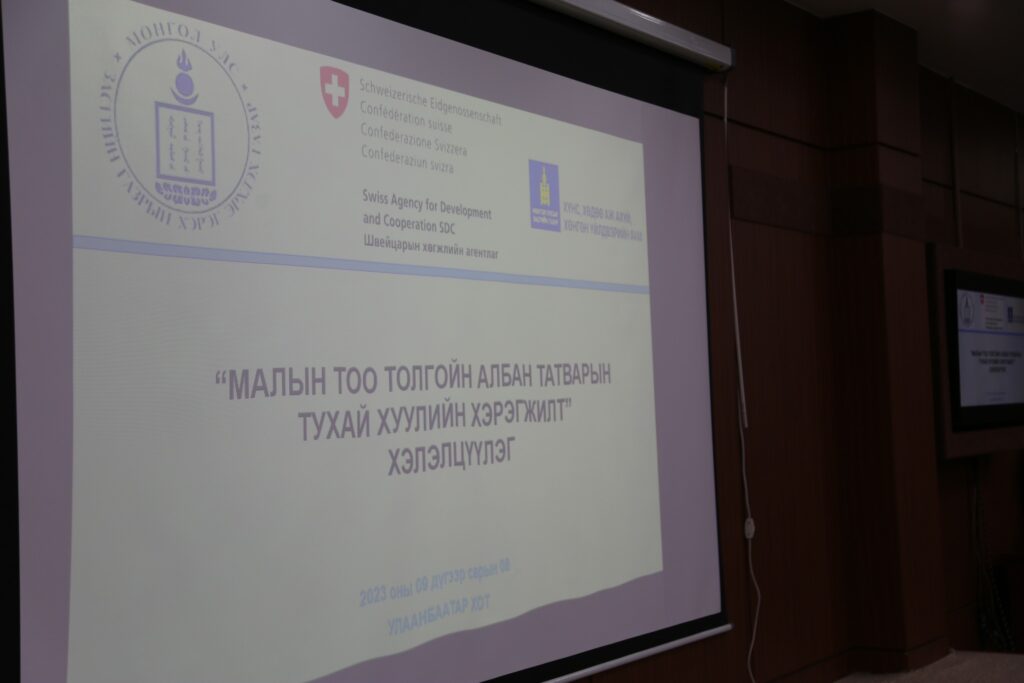 Швейцарын хөгжлийн агентлагийн дэмжлэгтэйгээр Засгийн газрын Хэрэг эрхлэх газар хэрэгжүүлж байгаа “Нутгийн өөрөө удирдах байгууллагын институцын чадавхыг бэхжүүлэх нь” төслийн хүрээнд “Малын тоо толгойн албан татварын хуулийн хэрэгжилт” сэдэвт хэлэлцүүлэг, сургалтыг Хүнс, хөдөө аж ахуй, хөнгөн үйлдвэрийн яаманд /2023.09.08/ зохион байгууллаа.