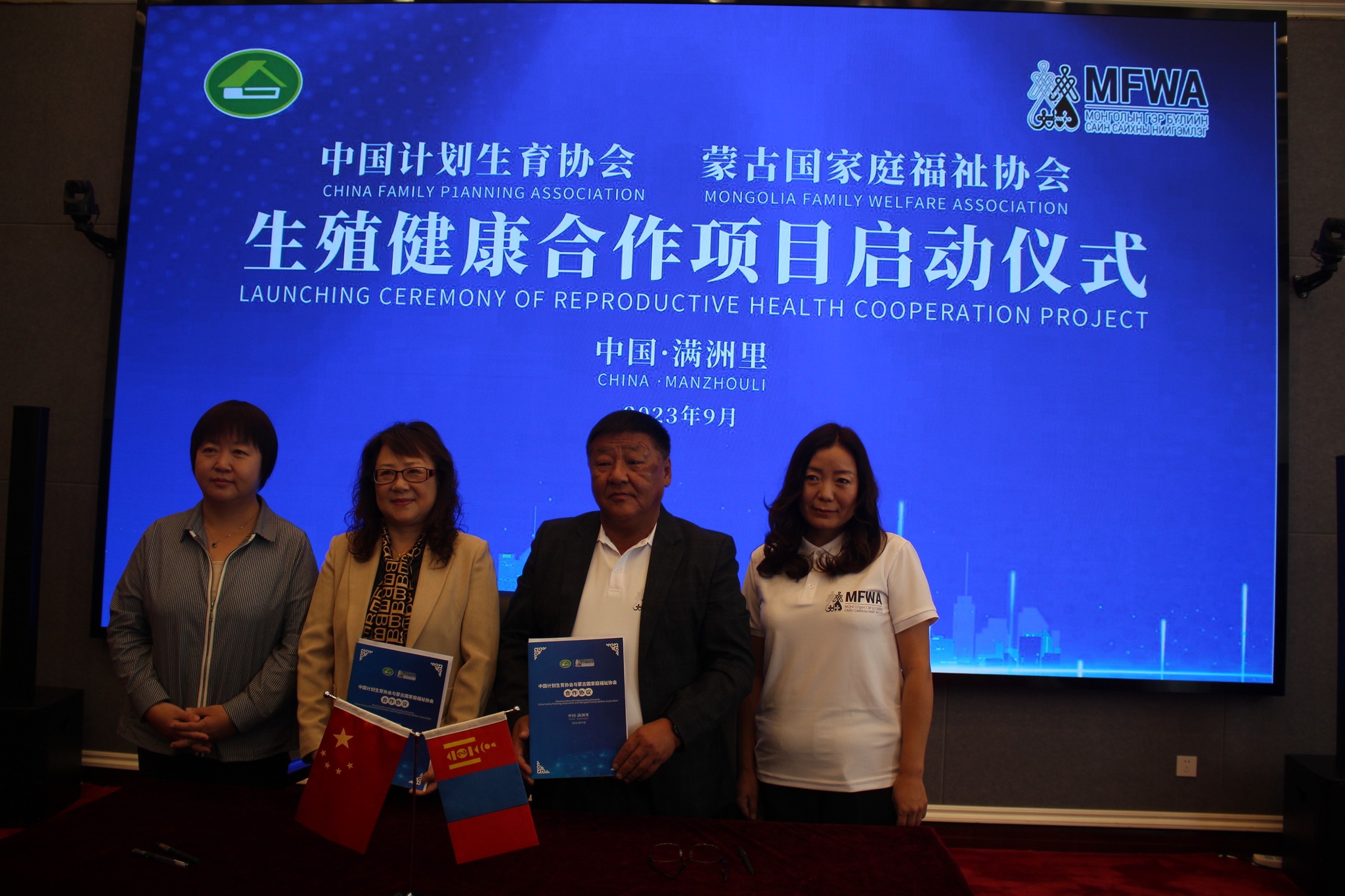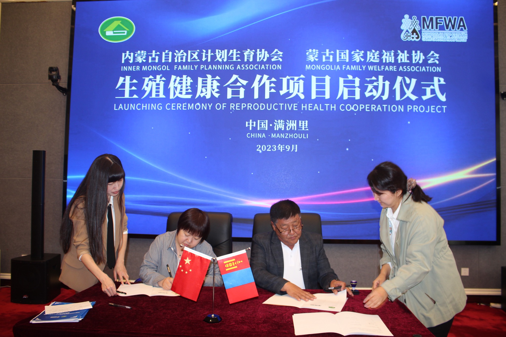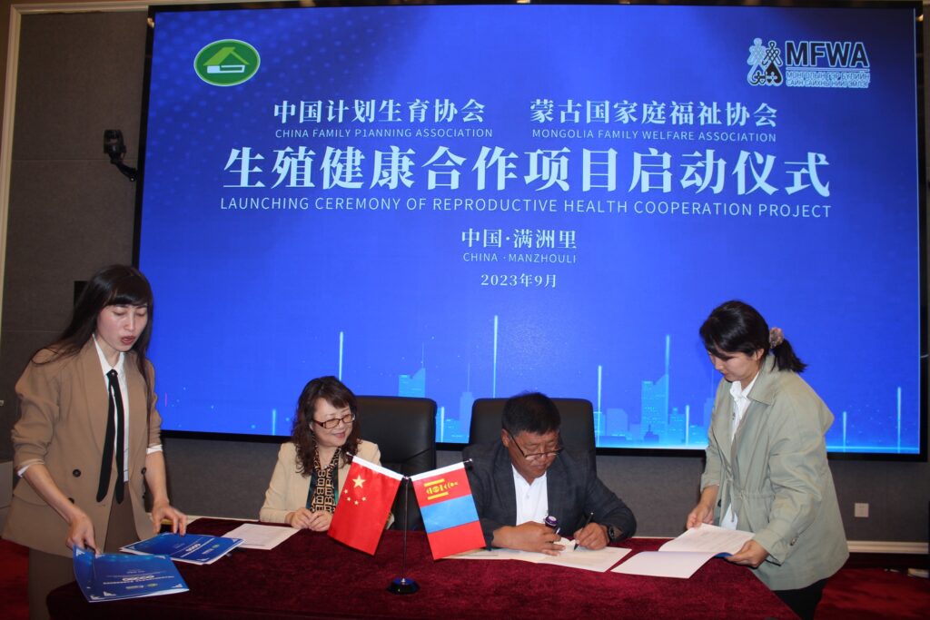 The signing ceremony of a memorandum of understanding on cooperation between the Mongolian Family Welfare Association (MFWA), the China Family Planning Association (CFPA), and Inner Mongolia Autonomous Region Family Planning Association was held on September 13 in Manjuur, China.