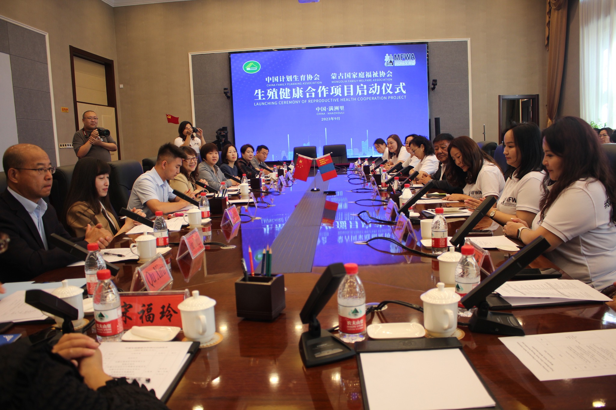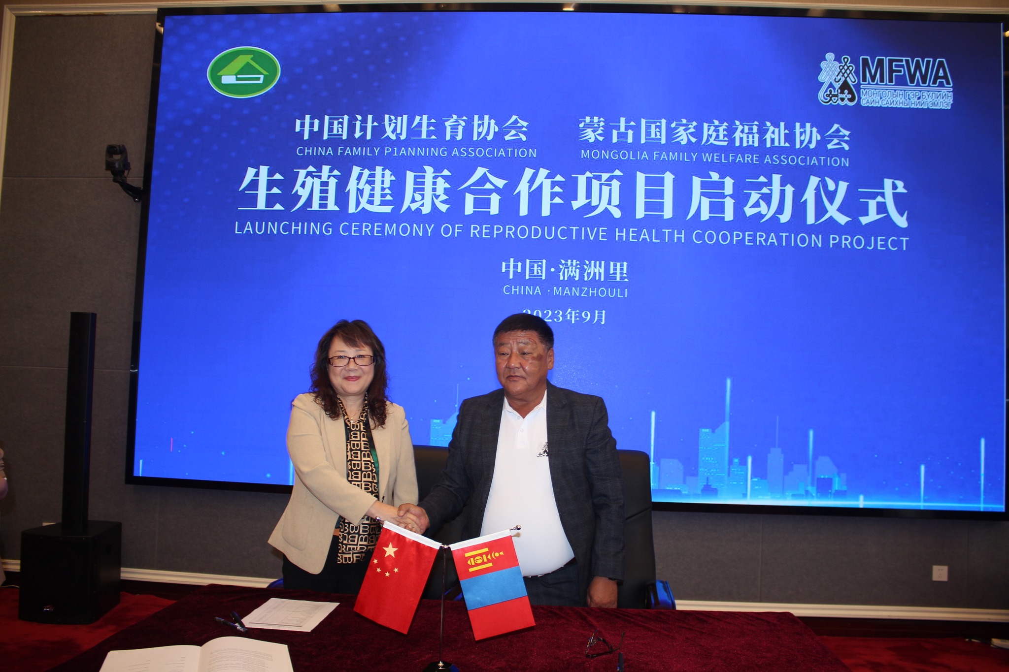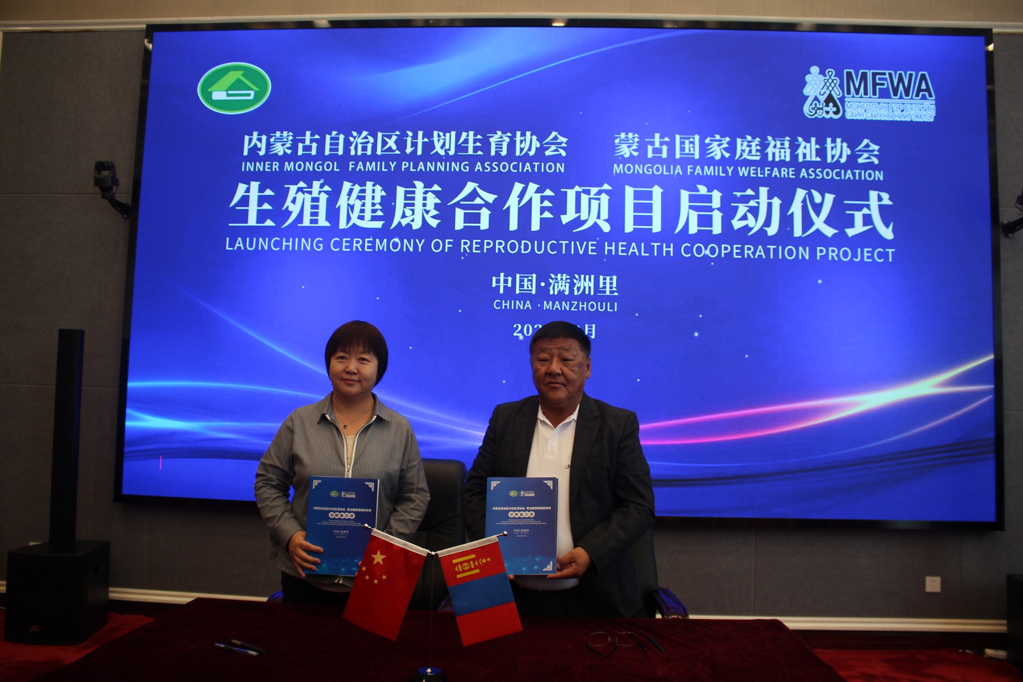 The signing ceremony of a memorandum of understanding on cooperation between the Mongolian Family Welfare Association (MFWA), the China Family Planning Association (CFPA), and Inner Mongolia Autonomous Region Family Planning Association was held on September 13 in Manjuur, China.