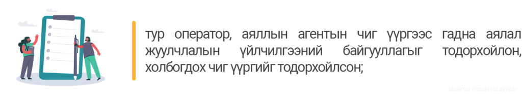 Хуульд аялал жуулчлалын үйл ажиллагаатай холбоотой дараах зохицуулалт тусгагдсан.