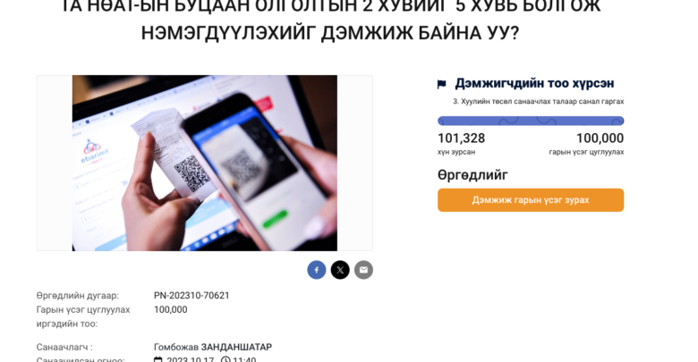 10 дугаар сарын 17-ны өдөр системд байршуулсан уг саналыг 6 хоногийн хугацаанд 100 мянган иргэн дэмжиж, саналаа цахимаар баталгаажуулснаар уг асуудлыг УИХ-аар шийдвэрлүүлэх боломжтой болсон юм.