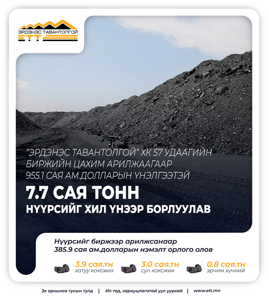 Үүнээс 3.9 сая тонн нүүрс нь хатуу коксжих чанартай нүүрс, 3.0 сая тонн нүүрс нь сул коксжих нүүрс, 0.8 сая тонн эрчим хүчний нүүрс байна. Нүүрсийг биржээр арилжсанаар 385.9 сая ам долларын нэмэлт орлого олоод байна.