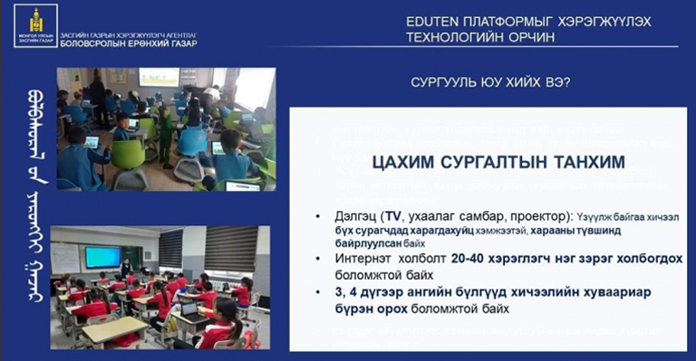 Ерөнхий боловсролын сургуулийн математикийн сургалтын хөтөлбөрийн хэрэгжилтийг дэмжих математикийн цахим системийг сургалтад нэвтрүүлэх “Eduten” платформ амжилттай хэрэгжиж байгаа бөгөөд энэ хүрээнд цахим сургалтын орчин бүрдүүлэлтэд тодорхой ахиц гарч байна.