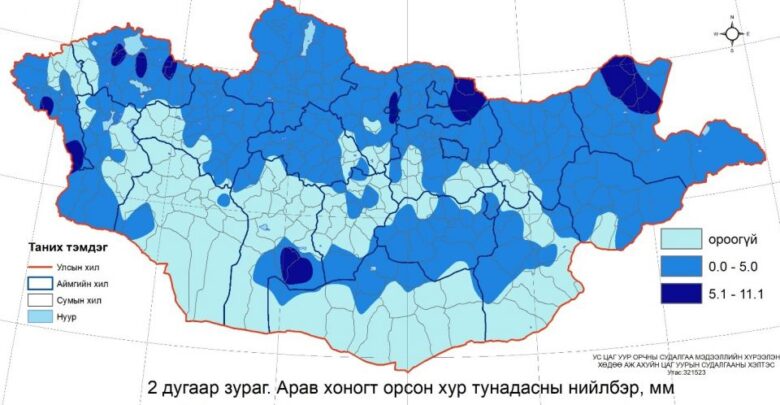 Төвийн ихэнх, Говь-Алтай, Завхан, Архангай, Өвөрхангай, Хөвсгөл, Булган, Орхон, Сэлэнгэ, Дархан-Уул, Хэнтий, Дорнодын зарим, Баян-Өлгий, Увс, Дорноговь, Сүхбаатарын ганц нэг сумдын нутгаар 5,1-10 см, бусад нутагт 1-5 см (3 дугаар зураг), хунгарлаж шуурсан газартаа 60 см хүртэл зузаан цастай байна.