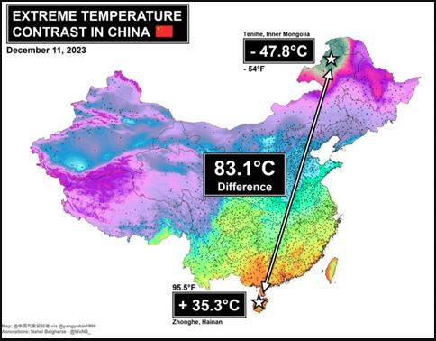 БНХАУ-ын хойд бүс буюу ӨМӨЗО-ны нутгуудаар -47.8 хэмд хүрсэн бол өмнөд бүс нутгаар +35.3 хэмд хүрч халсан байна. Ийнхүү нэг улсын нутаг дэвсгэрт цаг агаарын ийм хэмжээний зөрүүтэй нөхцөл байдал урд өмнө нь тохиолдож байгаагүй аж.