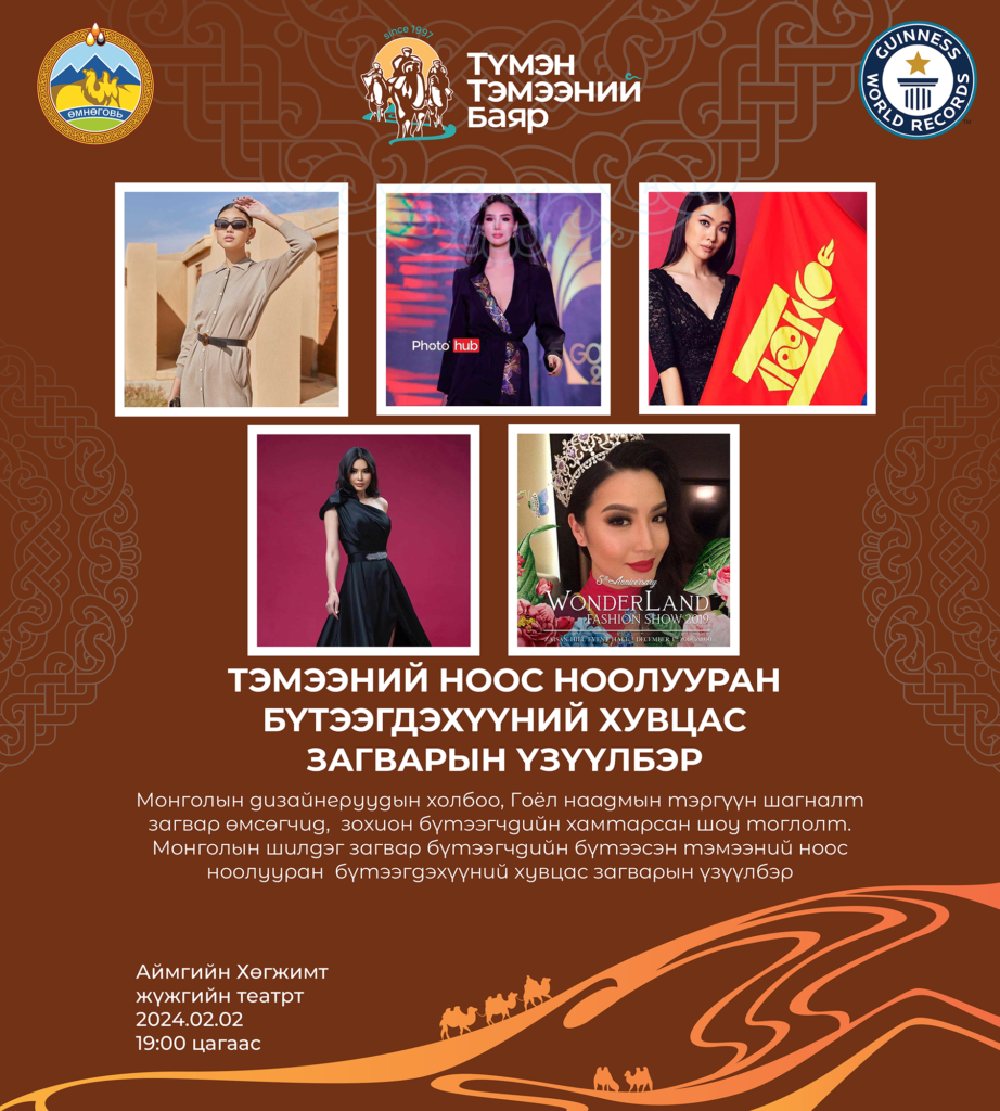 Мөн Хурд хамтлагийн “Би Монголтойгоо адилхан” тоглолт 2024.02.02 19:00 цагт Өмнөговь Даланзадгад хотын Аймгийн хөгжимт жүжгийн театрт тоглогдох бол Монголын дизайнеруудын холбоо, Гоёл наадмын тэргүүн шагналт загвар өмсөгчид Монголын шилдэг загвар бүтээгчдийн урласан тэмээний ноос ноолууран бүтээгдэхүүний хувцас загварын үзүүлбэрээ толилуулах аж.