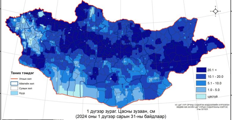 Цаг уурын байгууллагаас арав хоногт нэг удаа хийдэг хээрийн цасны хэмжилтийн мэдээгээр нэгдүгээр сарын 31-ний байдлаар нийт нутгийн 90 гаруй хувьд цасан бүрхүүл тогтжээ.