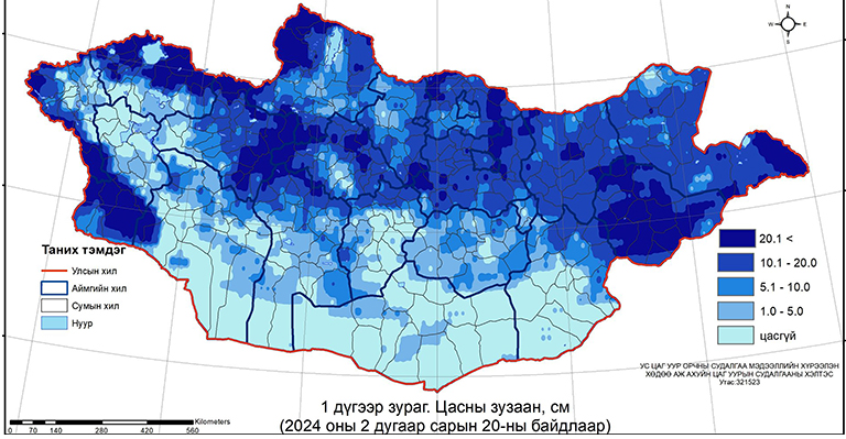 Арав хоногт нэг удаа хийдэг хээрийн цасны хэмжилтийн мэдээгээр 2 дугаар сарын 20-ны байдлаар нийт нутгийн 80 гаруй хувьд цастай байгаагаас Алтай, Хангай, Хэнтэй, Хөвсгөлийн уулархаг нутаг, Хан Хөхий, Хантайшир, Монголын Дорнод тал болон говийн нутгийн зарим хэсгээр 10-51 см, бусад нутагт 1-9 см (1 дүгээр зураг), хунгарлаж шуурсан газартаа 80 см, гуу жалгандаа 100 см хүртэл зузаан цастай байна.