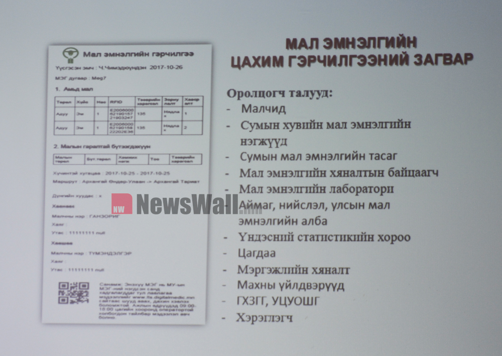 Малын эмчийн бүх хийх ажил хийгдсэн бол байцаагч “Зөвшөөрөв” гэсэн нэг л товч дарахад 100 км цаана байгаа малчны хотод хариу нь цаг алдалгүй очино. Малын эмчийн бүсэнд гэрчилгээ хэвлэгдэн гарах төхөөрөмж өлгөөтэй байна. Өнөөдөр А4-ийн үнэт цаасан дээр хэвлэж байгаа бол кассын билл дээр л хэвлэгдэнэ. Бидний хувьд гэрчилгээний цаана байгаа мэдээлэл, түүхэндээ үнэ цэнэ нь байх юм. Цаас нь хямдхан. Гэрчилгээний ерөнхий загварыг гаргахдаа бид малчдаас эхлээд хэрэглэгч хүртэлх олон талуудын эрх ашиг сонирхоыг шингээсэн. Тухайлбал, Цагдаагийн байгууллага малын хулгайтай тэмцэхэлд маш их зардал гарган ажилладаг. Систем бүрэн нэвтэрчихвэл тэр бүх асуудлыг системэээрээ шийдчихнэ.