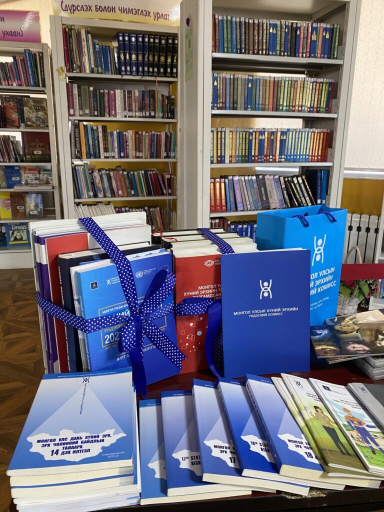 Тус ажлын хүрээнд Хүний эрхийн Үндэсний Комиссын референт Н.Туул 2024 оны 03 дугаар сарын 01-ний өдөр Монгол улс дахь хүний эрх, эрх чөлөөний тайлан илтгэлүүд, Хүний эрхийн олон улсын гэрээний хэрэгжилтийн талаарх Монгол Улсын ээлжит илтгэлүүд, НҮБ-ын гэрээний хороод, хүний эрхийн төлөв байдлын ээлжит нэгдсэн хэлэлцүүлгээс Монгол улсад өгсөн зөвлөмжүүд, хүний эрхийн чиглэлийн судалгааны ажил, эрдэм шинжилгээний бүтээл, гарын авлагаас бүрдсэн 42 төрлийн 88 ширхэг ном гарын авлагыг хүлээлгэн өгөв.