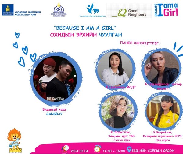 Олон улсын эмэгтэйчүүдийн эрхийг хамгаалах өдрийг тохиолдуулан Нийслэлийн Баянзүрх дүүргийн Хүүхэд, гэр бүлийн хөгжил хамгааллын хэлтэс ХНХЯ, Монголын сайн дурынхны төв, “Goodneighbors” Олон Улсын байгууллагатай хамтран “Because i`am a girl” охидын эрхийн чуулганыг зохион байгууллаа. Тус чуулган нь охидын нийтлэг эрхийг баталгаажуулах, нийгмийн өмнө тулгамдаж буй асуудлуудаар тэдгээрийн дуу хоолойг бодлого боловсруулагчид, хүүхэд хамгаалал, хүний эрхийн оролцогчдод хүргэхээр зорьсон аж.