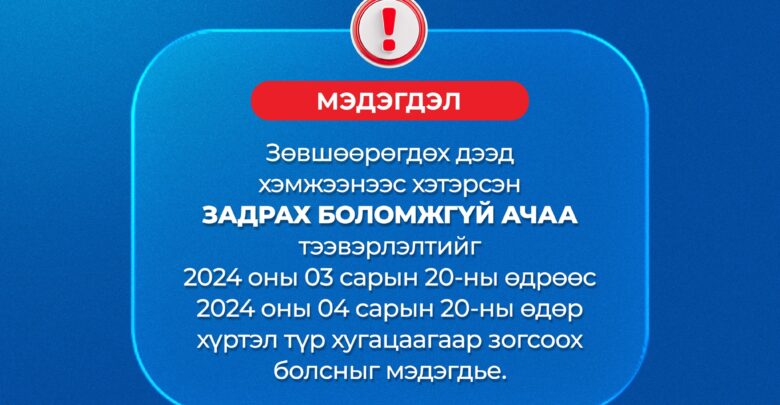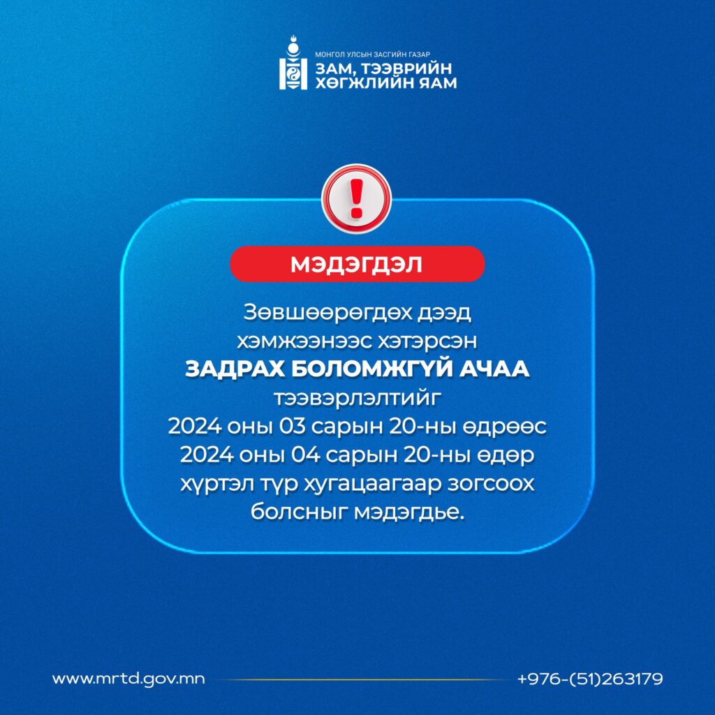 Тиймээс маргааш буюу 2024 оны 03 дугаар сарын 20-ны өдрөөс 2024 оны 04 дүгээр 20-ны өдөр хүртэл автотээврийн хэрэгслийн байдалд тавих ерөнхий шаардлага MNS 4598:2020 стандартад заасан автотээврийн хэрэгслийн бүх жингийн зөвшөөрөгдөх дээд хэмжээнээс хэтэрсэн ЗАДРАХ БОЛОМЖГҮЙ АЧАА тээвэрлэлтийг зогсоож байна.