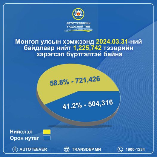 2024 оны 1-р улирлын байдлаар Монгол улсын хэмжээнд нийт 208,614 тээврийн хэрэгсэл техникийн хяналтын үзлэгт хамрагдсан байна