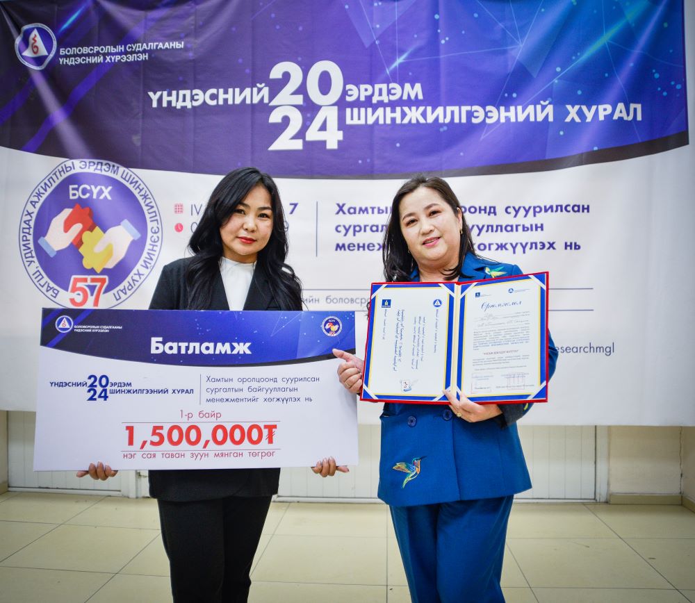 | “ХАМТЫН ОРОЛЦООНД СУУРИЛСАН СУРГАЛТЫН БАЙГУУЛЛАГЫН МЕНЕЖМЕНТИЙГ ХӨГЖҮҮЛЭХ НЬ” сэдэвт СӨБ-ын 2024 оны үндэсний эрдэм шинжилгээний хуралд шагналт байр эзэлсэн илтгэлийн мэдээлэл | |||